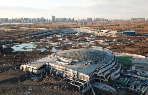 這是4月12日拍攝的哈爾濱冰雪大世界四季冰雪項目施工現(xiàn)場(無人機(jī)照片)。