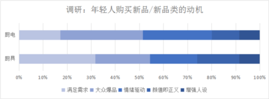 在此前京東發(fā)起的一項調(diào)研中,分析35歲以下人群購買廚房電器/廚具的動機(jī)可見,年輕人購買廚房電器時,受大眾口碑影響很大,而對廚具的顏值、設(shè)計感(增加人設(shè))的敏感度明顯更高。比如近幾年年輕人尤其是女性熱衷購買的顏值琺瑯鍋,無論是馬卡龍色還是鳶尾紫色,擺在廚房就是一道靚麗的風(fēng)景線。京東春季家裝節(jié)數(shù)據(jù)顯示,鍋具顏值擔(dān)當(dāng)?shù)拇砜岵市驴瞵m瑯鍋在開門紅的前28小時內(nèi)成交額同比增長15倍。