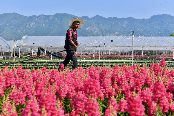 福建省福州市閩侯縣南通鎮(zhèn)蔬菜花卉種植基地的花農(nóng)在為鮮花澆水。新華社記者 姜克紅 攝