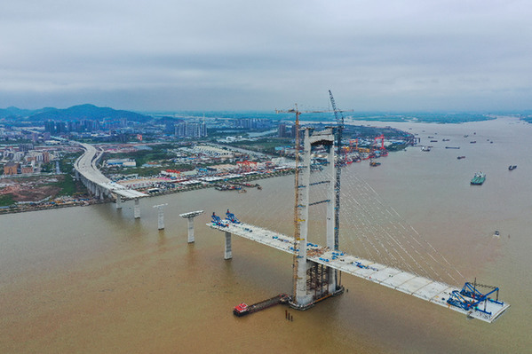 正在進(jìn)行箱梁架設(shè)的深中通道中山大橋建設(shè)現(xiàn)場(5月15日攝,無人機(jī)照片)。
