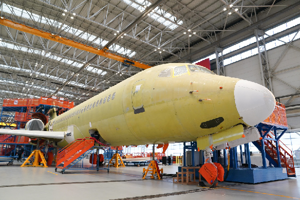 ▲中國(guó)商飛上海飛機(jī)制造有限公司總裝車間內(nèi)的國(guó)產(chǎn)ARJ21飛機(jī)。記者 丁汀 攝