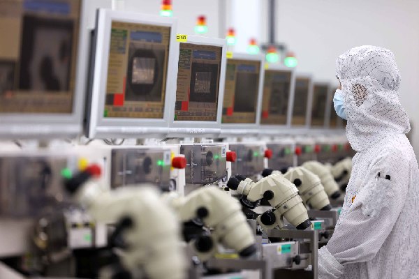在安徽省合肥經(jīng)濟技術開發(fā)區(qū)的合肥通富微電子有限公司,員工在鍵合生產(chǎn)線上作業(yè)。