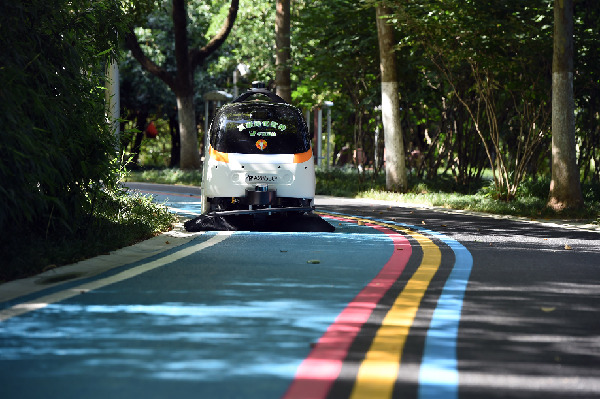 在合肥高新區(qū)蜀峰灣體育公園,智能無人清掃機器人在清掃路面。