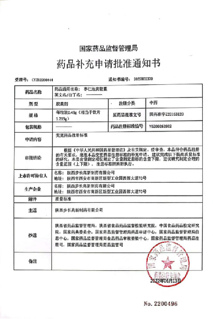 6月27日 ,步長高新“棗仁地黃膠囊”獲得國家藥品監(jiān)督管理局批準的藥品補充申請批準通知書,批準變更藥品注冊標準,批準日期2022年06月13日,變更后的質(zhì)量標準編號:YBZ00262022。