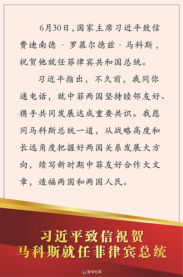 新華社北京6月30日電 6月30日,國家主席習(xí)近平致信費(fèi)迪南德·羅慕爾德茲·馬科斯,祝賀他就任菲律賓共和國總統(tǒng)。
