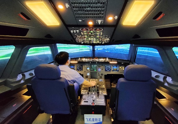 研究人員在全真模擬飛機(jī)座艙內(nèi)測(cè)試航空器防撞產(chǎn)品(5月12日攝)。 陳冬冬 攝