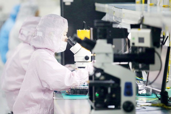 九州光電子公司員工在監(jiān)測(cè)產(chǎn)品生產(chǎn)(5月12日攝)。 陳冬冬 攝