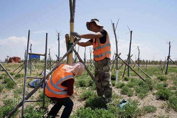 在內(nèi)蒙古能源發(fā)電投資集團(tuán)錫林郭勒勝利礦業(yè)有限公司勝利西三礦的礦山公園,工人們在養(yǎng)護(hù)樹木。記者 侯維軼 攝