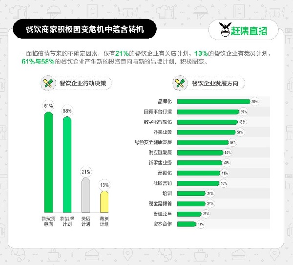 但即便面臨著疫情帶來(lái)的種種壓力,報(bào)告同時(shí)也揭示,僅有二成餐飲企業(yè)有撤店或閉店等計(jì)劃,13%的餐飲企業(yè)有裁員打算,61%與58%的餐飲企業(yè)產(chǎn)生新的投資意向與新的品牌計(jì)劃,可見更多的企業(yè)正在積極圖變。