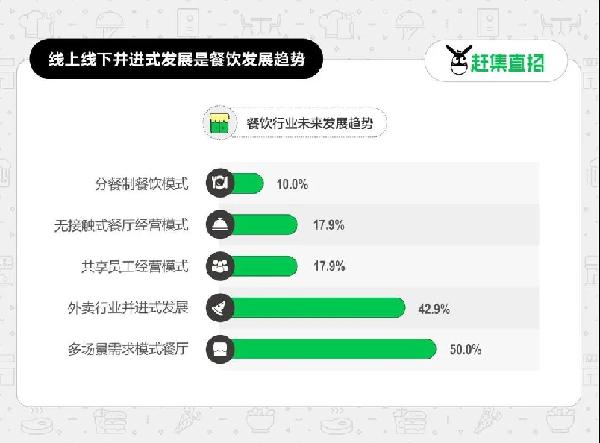 調(diào)研報告指出,對于從業(yè)者而言,開展多場景融合經(jīng)營方式可有效緩解疫情帶來的經(jīng)營壓力,堂食+外賣的線上線下并進式發(fā)展是餐飲業(yè)的主流趨勢。