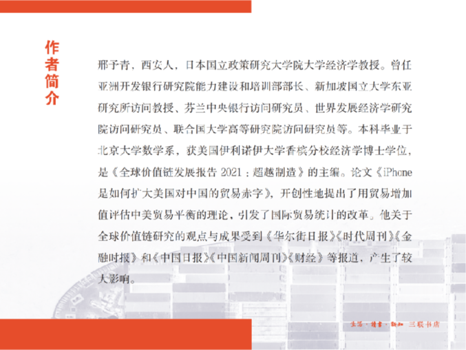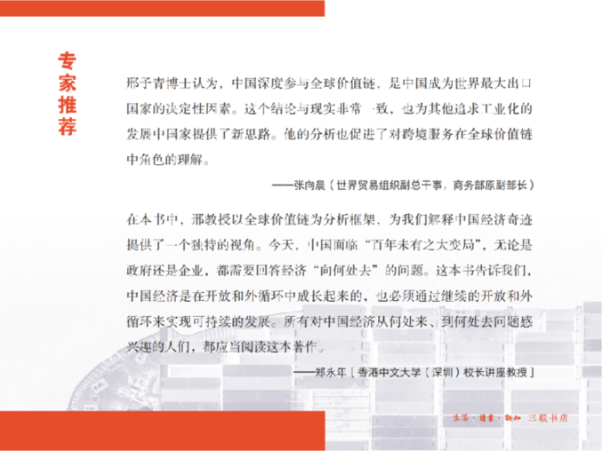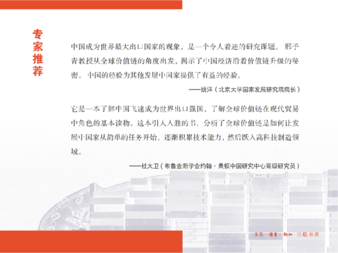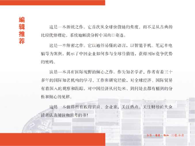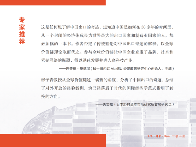 該書作者邢予青是日本國立政策研究大學院大學經(jīng)濟學教授,研究全球價值鏈十余年。不同于李嘉圖的比較優(yōu)勢理論、赫克歇爾-奧林模型或者保羅·克魯格曼教授提出的基于規(guī)模經(jīng)濟的新貿(mào)易理論,該書第一次以全球價值鏈為框架,從中國企業(yè)在全球價值鏈中扮演的角色出發(fā),揭示了跨國公司的技術、品牌和市場營銷網(wǎng)絡對中國出口奇跡形成的決定性作用,闡述了全球價值鏈如何推動中國出口快速增長的機制。