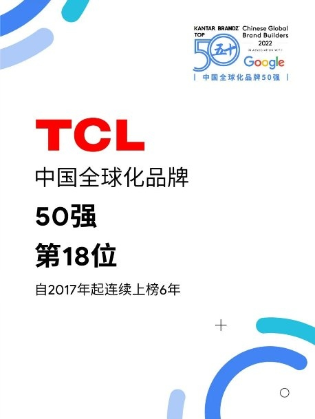 7月27日,谷歌與凱度聯(lián)合對外發(fā)布了“2022凱度BrandZ?中國全球化品牌50強(qiáng)”榜單及報(bào)告。智慧科技品牌TCL排名第18,連續(xù)六年上榜,品牌力得分614,同比增長7%。