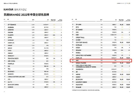 近日,全球知名品牌排行榜凱度BrandZ攜手谷歌發(fā)布了《BrandZ中國全球化品牌》研究報告,揭曉2022年全球化品牌50強及成長明星榜單,江汽集團位列中國全球化品牌第40位,中國汽車品牌第5位,品牌力成長率較2021年增長3%。這是繼2021年作為新晉品牌首次上榜之后,江汽集團再一次榮登該權威榜單,展現(xiàn)了持續(xù)、強勁的品牌增長勢頭。