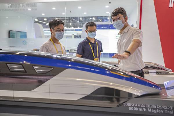 8月22日,在2022智博會中國中車展廳,工作人員(右)向嘉賓介紹時速600公里高速磁懸浮交通系統(tǒng)。新華社記者 黃偉 攝?