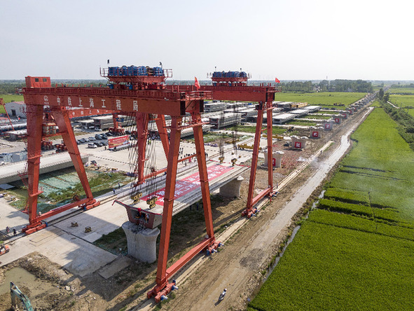 滬渝蓉高鐵天門段首榀箱梁架設(shè)現(xiàn)場