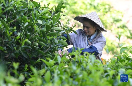 海南省五指山市水滿鄉(xiāng)毛納村茶農(nóng)在茶園采茶(2022年4月10日攝)。 新華社記者 楊冠宇 攝