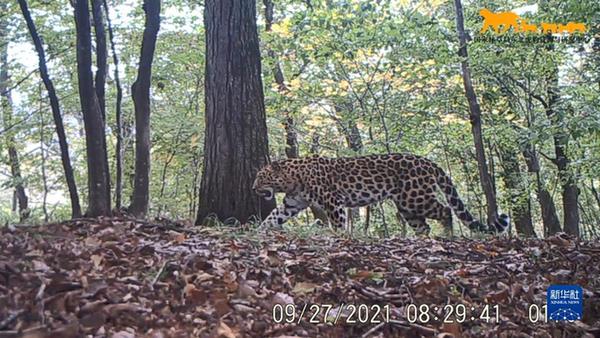 這是2021年9月27日利用“天地空一體化監(jiān)測系統(tǒng)”在東北虎豹國家公園內(nèi)監(jiān)測到的野生東北豹影像(視頻截圖)。 新華社發(fā)