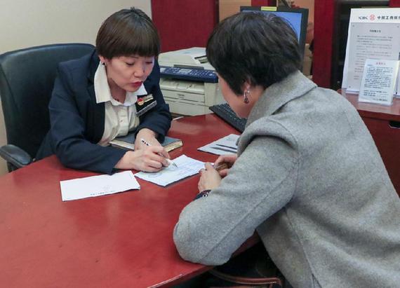 在中國工商銀行新疆烏魯木齊的一處營業(yè)網(wǎng)點,李鵬(左)為客戶解答問題(2018年11月攝)。新華社發(fā)