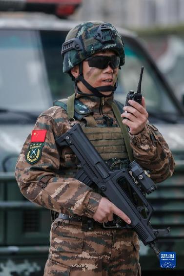 武警河北總隊(duì)某部大隊(duì)長(zhǎng)李闖在演練中下達(dá)任務(wù)指令(2021年3月4日攝)。新華社發(fā)(張丹 攝)