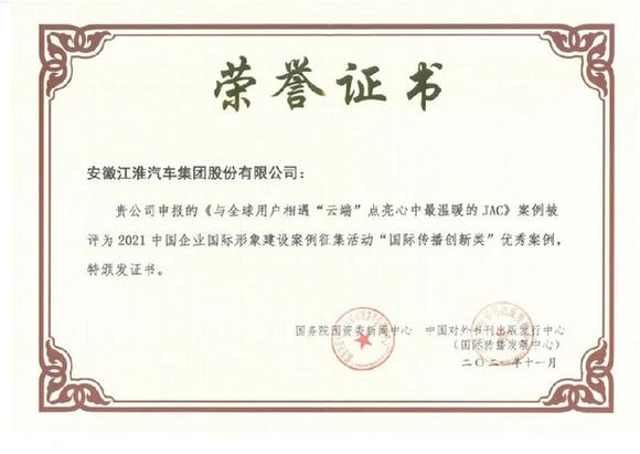 江汽集團(tuán)獲得“國際傳播創(chuàng)新獎”