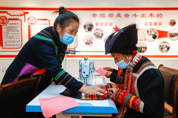 10月27日,在四川省涼山州昭覺(jué)縣南坪社區(qū)的彝繡工坊,易地扶貧搬遷到此的婦女在交流彝繡技藝。這個(gè)彝繡工坊有100多名繡娘,依照訂單制作彝族傳統(tǒng)服飾制品,繡娘們?cè)诖遂`活就業(yè),既能為家庭增收,又方便照顧家中老人和孩子,每年可增收數(shù)千至上萬(wàn)元。