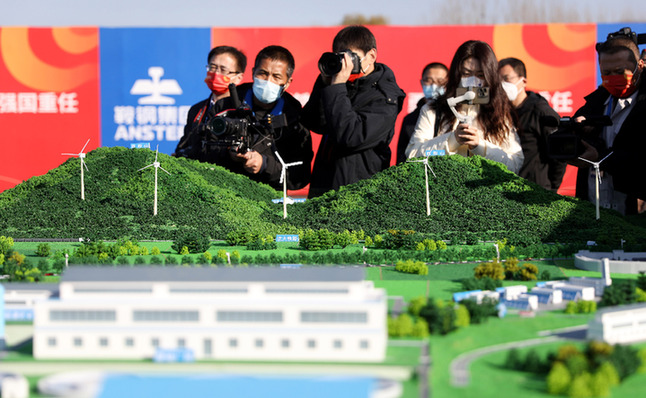 ??? 11月16日,參加鞍鋼西鞍山鐵礦項(xiàng)目開工儀式的媒體記者在拍攝鐵礦項(xiàng)目沙盤。新華社記者 姚劍鋒 攝
