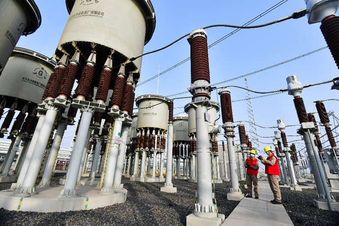 國網(wǎng)天津電力工作人員在1000千伏特高壓海河變電站內(nèi)開展設(shè)備特巡檢查。(國網(wǎng)天津電力供圖)