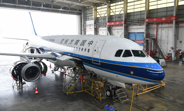 2023年1月5日,在位于海南省??谑械闹袊?guó)南方航空美蘭基地機(jī)庫(kù),工程師在對(duì)飛機(jī)進(jìn)行檢修。