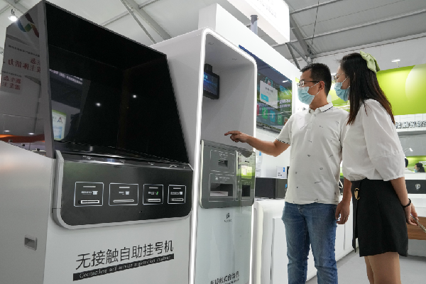 2022年9月15日,在2022年全國大眾創(chuàng)業(yè)萬眾創(chuàng)新活動周合肥主會場的主題展區(qū)中,參展人員體驗非接觸式自助機。新華社記者 杜宇 攝