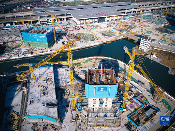紹興北站TOD綜合交通樞紐工程建設(shè)現(xiàn)場(2023年1月31日攝,無人機照片)。由中建三局承建的這項工程為浙江省重點工程,建成后將是集商務(wù)辦公、科創(chuàng)研發(fā)、星級酒店等多重功能于一體的智慧型城市交通綜合體。新華社記者 江漢 攝
