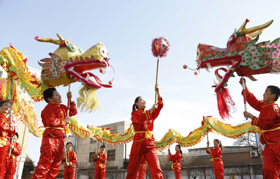2月21日,河北省邢臺市東牛角小學(xué)學(xué)生在表演舞龍。