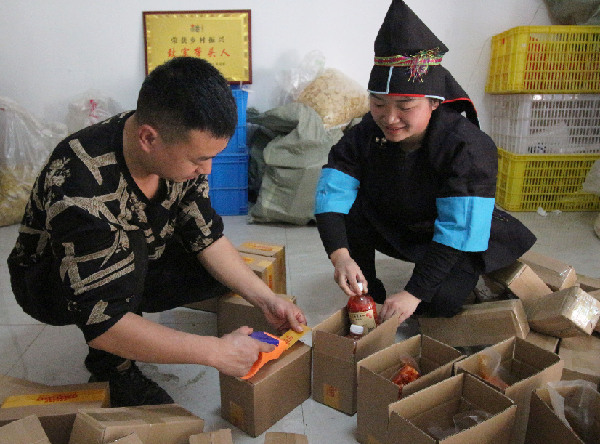3月4日,榕江縣的“直播達(dá)人”王啟紅(右)在貴州榕江兩汪鄉(xiāng)兩汪村打包產(chǎn)品。(陶明霞 攝)