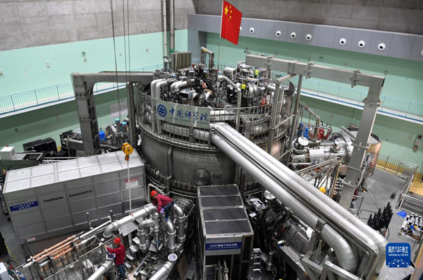 在中科院合肥物質(zhì)科學(xué)研究院,工作人員對(duì)有“人造太陽”之稱的全超導(dǎo)托卡馬克核聚變實(shí)驗(yàn)裝置(EAST)進(jìn)行升級(jí)改造(2021年4月13日攝)。新華社記者 劉軍喜 攝