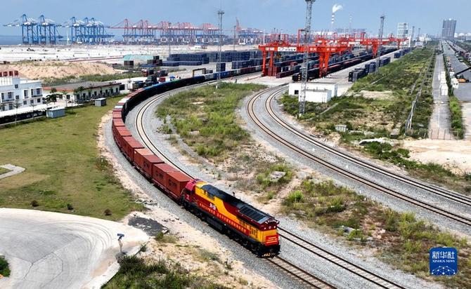 這是從廣西欽州港發(fā)出的首趟“北部灣—西藏”班列(2022年9月17日攝,無人機(jī)照片)。新華社記者 張愛林 攝