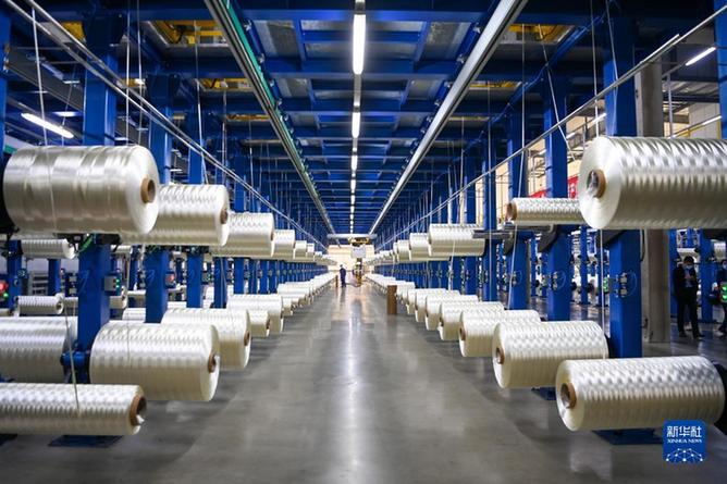 在吉林化纖集團(tuán)國興碳纖維公司生產(chǎn)車間,工人在整理碳纖維原絲(2022年10月31日攝)。新華社記者 顏麟蘊(yùn) 攝