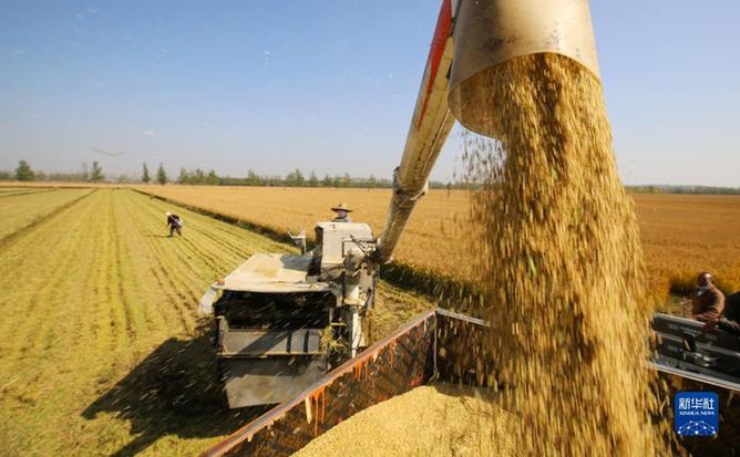 山東省臨沂市郯城縣郯城街道農(nóng)民將收獲的水稻裝車(2022年10月23日攝)。新華社發(fā)(張春雷攝)