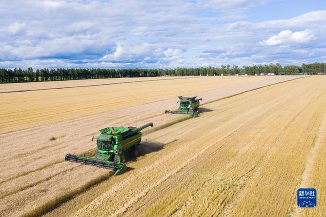 聯(lián)合收割機(jī)在黑龍江北大荒集團(tuán)紅星農(nóng)場有限公司田間收獲小麥(2022年8月10日攝,無人機(jī)照片)。新華社記者 謝劍飛 攝