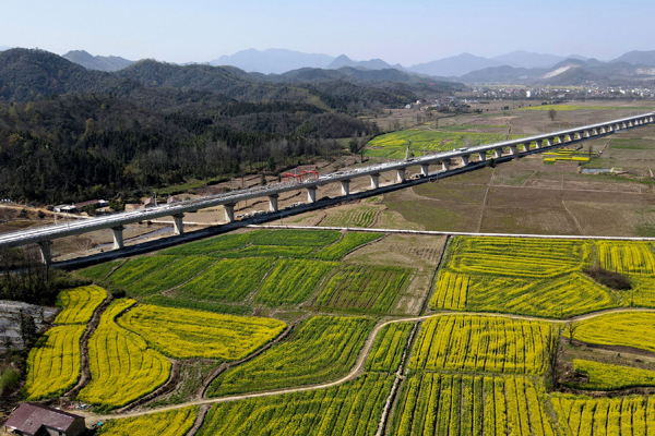 這是3月14日拍攝的中鐵十一局池黃鐵路無砟軌道施工現(xiàn)場(無人機照片)。