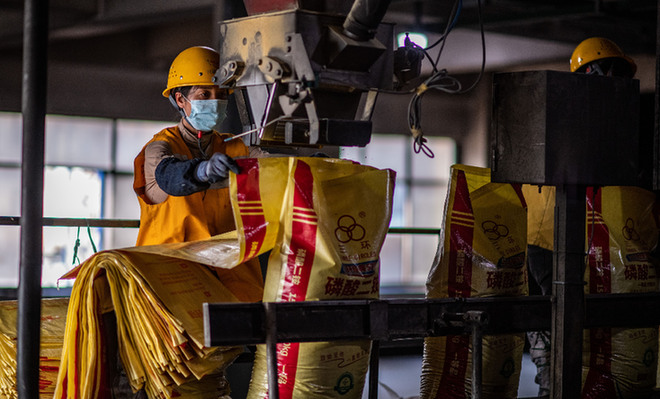 工人在云天化天安化工磷肥制造中心生產(chǎn)線進(jìn)行袋裝操作。新華社記者 江文耀 攝