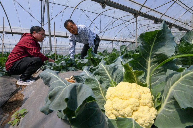 國家大宗蔬菜產業(yè)技術體系花椰菜育種崗位專家孫德嶺(右)與副研究員牛國保在實驗地里調查不同試驗組合花椰菜種長勢情況。新華社記者 孫凡越 攝