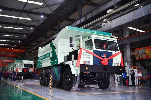 位于西安市北部的閻良區(qū)的中鐵長安重工有限公司,工人在生產(chǎn)線上試乘即將下線的95噸純電動礦用自卸車。記者 張博文 攝