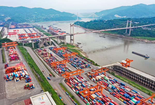 果園港水運(yùn)、公運(yùn)和鐵運(yùn)的立體物流網(wǎng)絡(luò)正為川渝兩地經(jīng)貿(mào)發(fā)展輸入源源不斷的動(dòng)能。受制于長(zhǎng)江上游航道限制,四川境內(nèi)的大宗物流往往要在果園港實(shí)現(xiàn)“散改集”,再經(jīng)由黃金水道運(yùn)往東部地區(qū);而從東部地區(qū)運(yùn)輸貨物可在果園港進(jìn)行“大改小”,從而滿足上游航行條件,分發(fā)到四川各地。