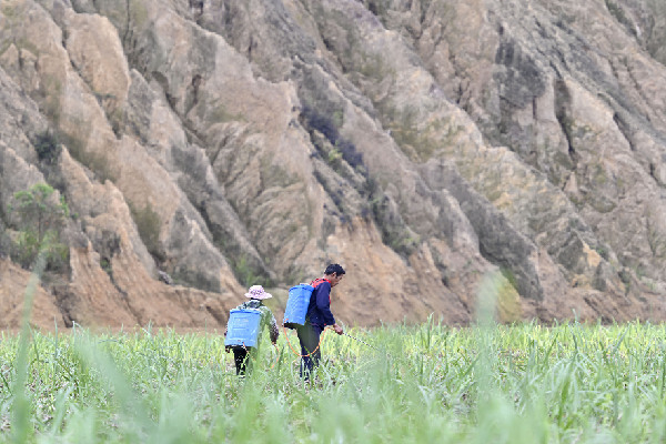 在柳州市柳江區(qū)穿山鎮(zhèn)思榮村,農(nóng)民在蔗田里忙碌。