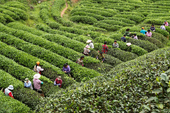 4月26日,農(nóng)民在福建省武夷山市天心村一處生態(tài)茶園內(nèi)采茶。