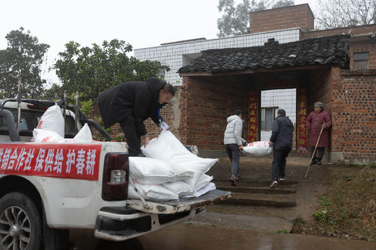 四川省瀘縣供銷(xiāo)合作社農(nóng)資服務(wù)員把化肥和種子送到村民家中。資料照片