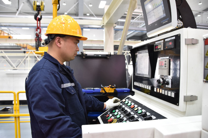車間里高達(dá)3.6米、長24米、寬14米的大尺寸冷鐓機(jī)“吃”進(jìn)去一圈圈鋼材,每分鐘能“吐”出45個大號螺栓,這些螺栓將用于起重機(jī)、盾構(gòu)機(jī)等大型工程機(jī)械。
