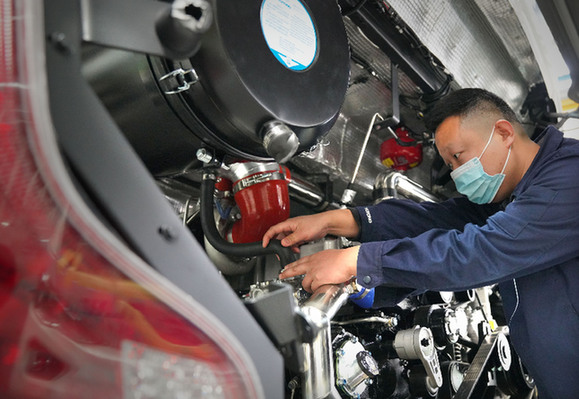 工作人員在宇通新能源廠區(qū)高端及海外承裝車間進行發(fā)動機檢測。記者 李安 攝
