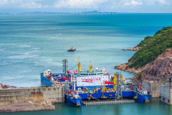 “一航津安1”號沉管運輸安裝一體船拖帶E23管節(jié)和最終接頭從珠海桂山島啟航,前往沉放水域(6月8日攝,無人機(jī)照片)。