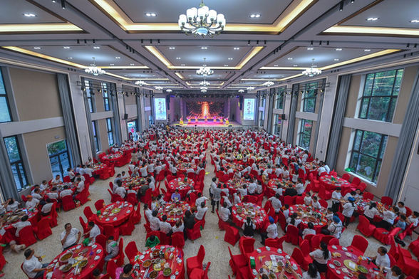 浙江建德市新安江街道梅坪村村民在村文化禮堂內(nèi)參加百家宴并觀看文藝演出(2023年5月27日攝)。新華社記者 徐昱 攝