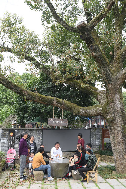在浙江杭州市余杭區(qū)小古城村一株老樟樹下,村民在商議鄉(xiāng)村發(fā)展事項(2022年3月14日攝)。新華社記者 翁忻旸 攝